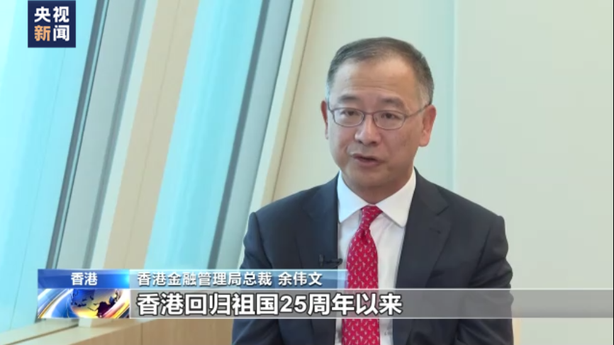 香港金融管理局总裁 余伟文:香港回归祖国25周年以来,其实香港的金融市场规模就增加了非常非常多,我们非常独特的优势,就是我们背靠祖国,面向国际。我们从很久以来都是担当一个国际跟内地市场的桥梁,所以我看这两个部分,继续保持我们香港金融系统的稳定,第二就是把握好国家开放给香港带来的不同的商机,我觉得就是我们最应该做,最能做去贡献于“一国两制”有利的发展的一个地方。