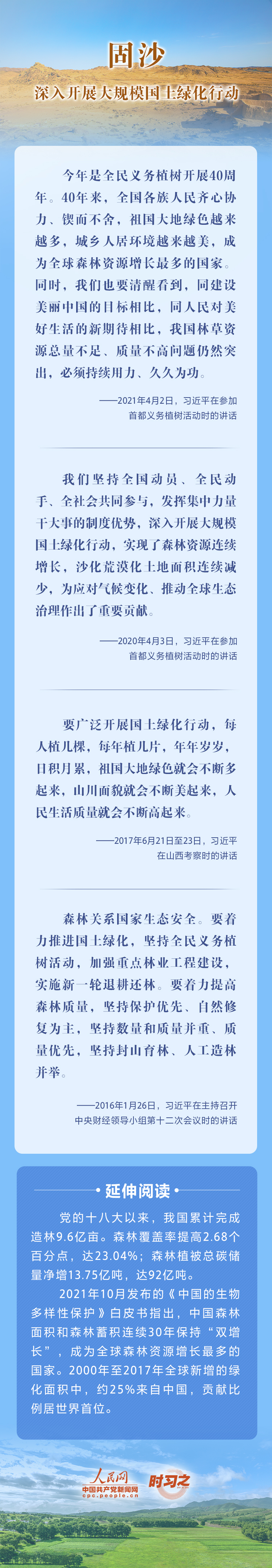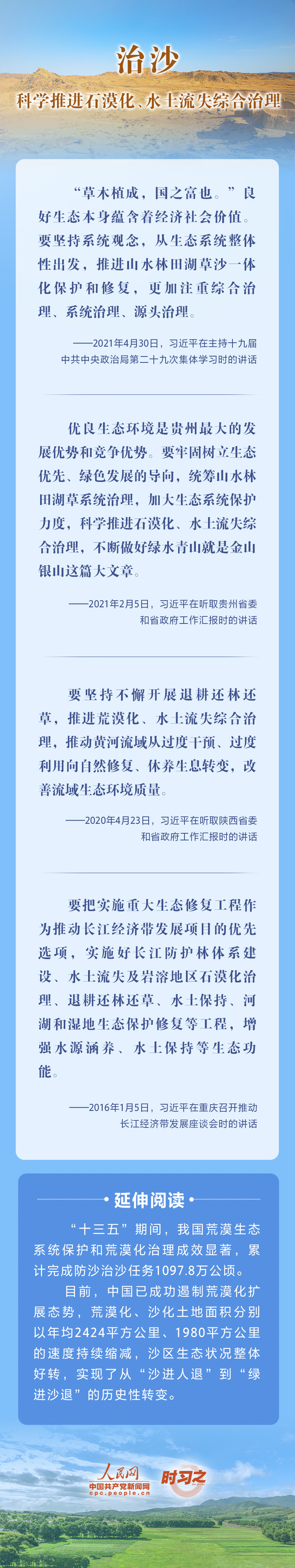 2022年6月17日是第二十八个世界防治荒漠化与干旱日。荒漠化是全球面临的重大生态问题,党的十八大以来,在习近平生态文明思想的指引下,我国荒漠化防治工作开辟了新境界、迈上了新台阶。让我们一起从总书记的重要论述里学习领悟中国践行绿色发展理念,坚定走好荒漠化防治之路的决心。