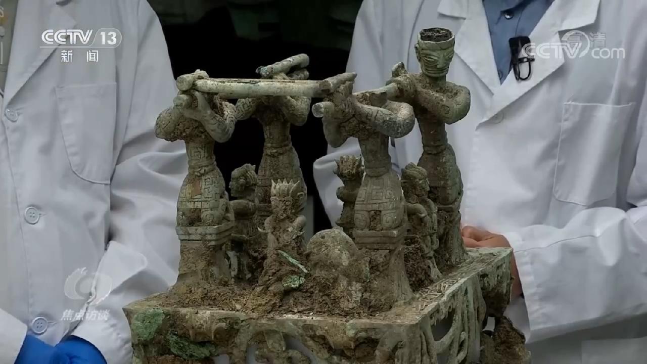 8号坑内工艺最复杂的器物青铜神坛,残件共分为三层,神兽位于神坛上部,中间一层初步估算有13个青铜人,其中4人将神兽抬起,其余或蹲坐,或呈跪姿,手的姿态也不太一样。