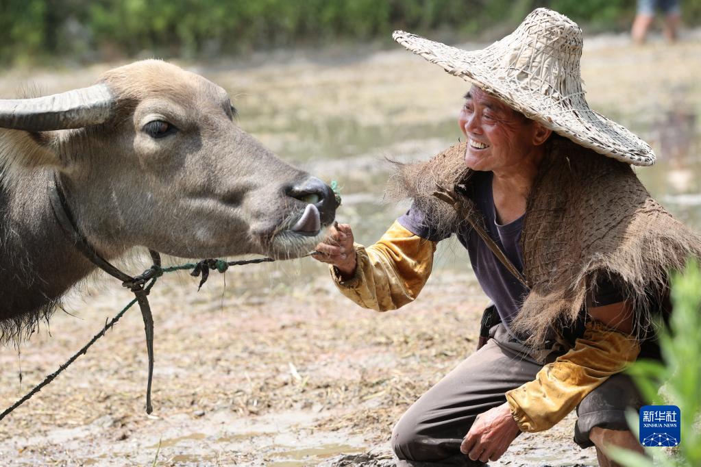 6月17日,在浙江省湖州市德清县莫干山镇筏头村,农户沈水根注视着他的耕牛“二牛子”。沈水根自16岁开始养牛耕田,“二牛子”已陪伴主人耕作3年多。