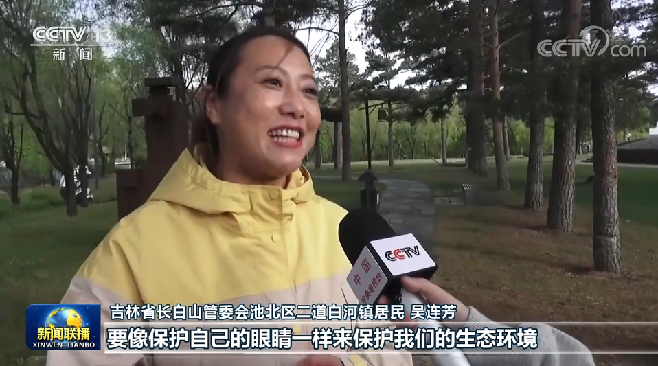 吉林省长白山管委会池北区二道白河镇居民 吴连芳:要像保护自己的眼睛一样来保护我们的生态环境,也希望世界各地的所有的游客都能到我们长白山来旅游、来做客,来感受一下我们长白山天然大“氧吧”的这种氛围,让长白山成为所有人我心向往之的旅游胜地。