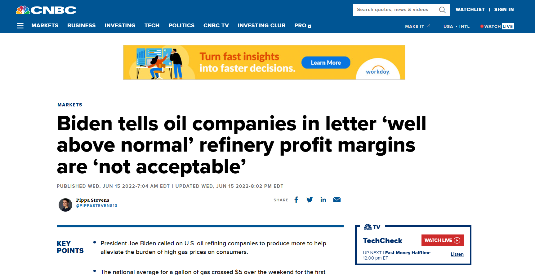 美国总统拜登此前已多次抨击石油公司从燃料供应紧张的局面中攫取了巨额利润。他在上周发给美国七家主要炼油企业的信中写道:“在战争时期,炼油厂的利润率远远高于正常水平,而企业将代价直接转嫁给美国人民,这是不可接受的。”