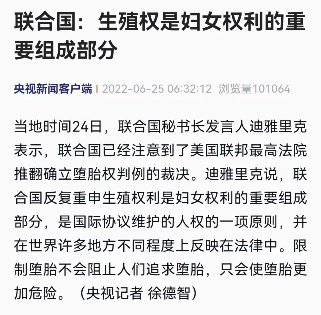 当地时间24日,联合国秘书长发言人迪雅里克表示,联合国已经注意到了美国联邦最高法院推翻确立堕胎权判例的裁决。迪雅里克说,联合国反复重申生殖权利是妇女权利的重要组成部分,是国际协议维护的人权的一项原则,并在世界许多地方不同程度上反映在法律中。限制堕胎不会阻止人们追求堕胎,只会使堕胎更加危险。