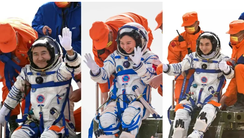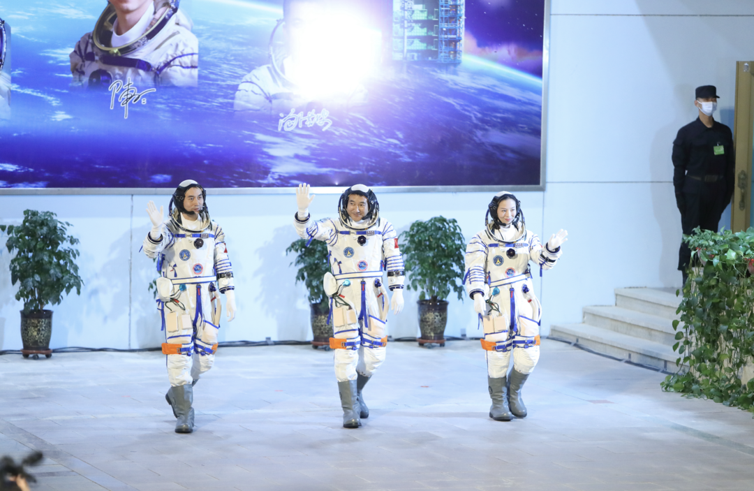2021年10月15日21时40分,神舟十三号载人飞行任务航天员乘组出征仪式,在酒泉卫星发射中心问天阁广场举行,翟志刚、王亚平、叶光富3名航天员领命出征。