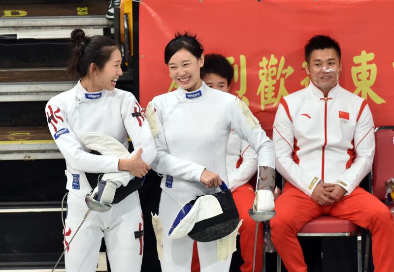 2021年12月4日,内地奥运健儿代表团访港一行进入第二天的活动。中国击剑选手孙一文(前右)与中国香港击剑选手江旻憓(前左)在活动中交谈。新华社记者卢炳辉摄