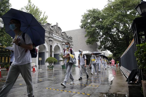 6月27日,北京二中学生在出示健康码、接受体温检测后按照指定通道进入校园。(新华社发)