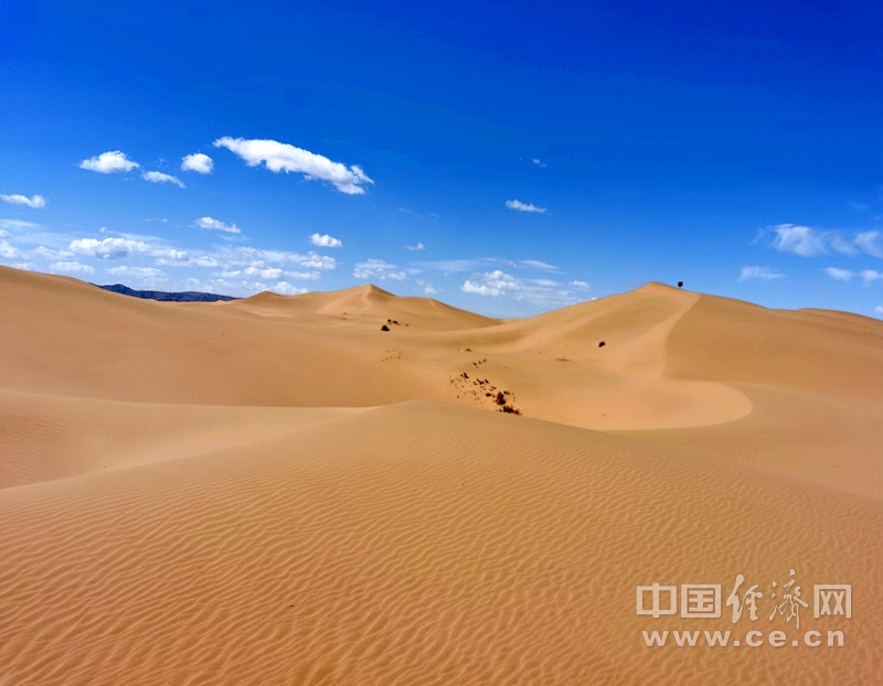 6月27日,“2022中国有约 A Date with China”采访团来到宁夏中卫沙坡头国家级自然保护区,探访腾格里沙漠边缘的“绿色屏障”。这里是历史上受风沙灾害最为严重的地区之一,在与沙漠的不懈抗争中,人民创造了“草方格”治沙法,建设生态防护林、生态经济林,形成“绿色屏障”,实现“人进沙退”。图为腾格里沙漠的漫漫黄沙。中国经济网记者 马常艳摄