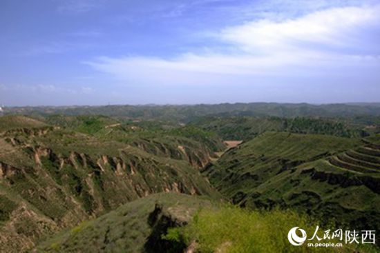 初夏时节,郝家桥的山峁间披上了绿装。人民网 吴超摄