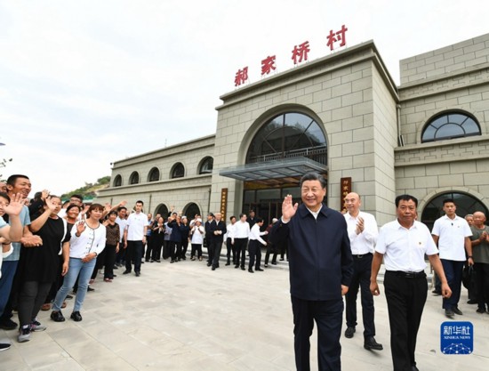 2021年9月13日至14日,中共中央总书记、国家主席、中央军委主席习近平在陕西省榆林市考察。这是14日下午,习近平在绥德县张家砭镇郝家桥村考察时,向乡亲们挥手致意。新华社记者 谢环驰摄