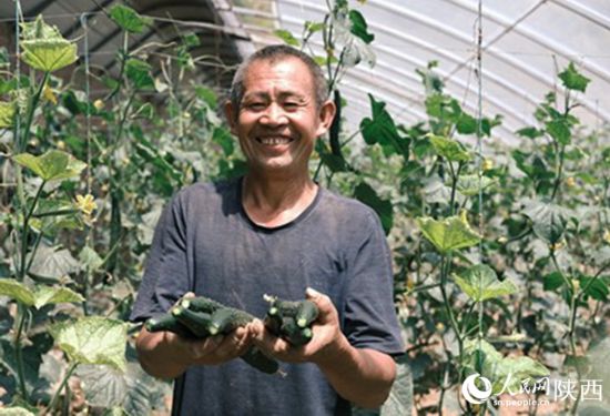在自家大棚里,高玉奇拿着刚采摘的黄瓜笑得合不拢嘴。人民网 吴超摄