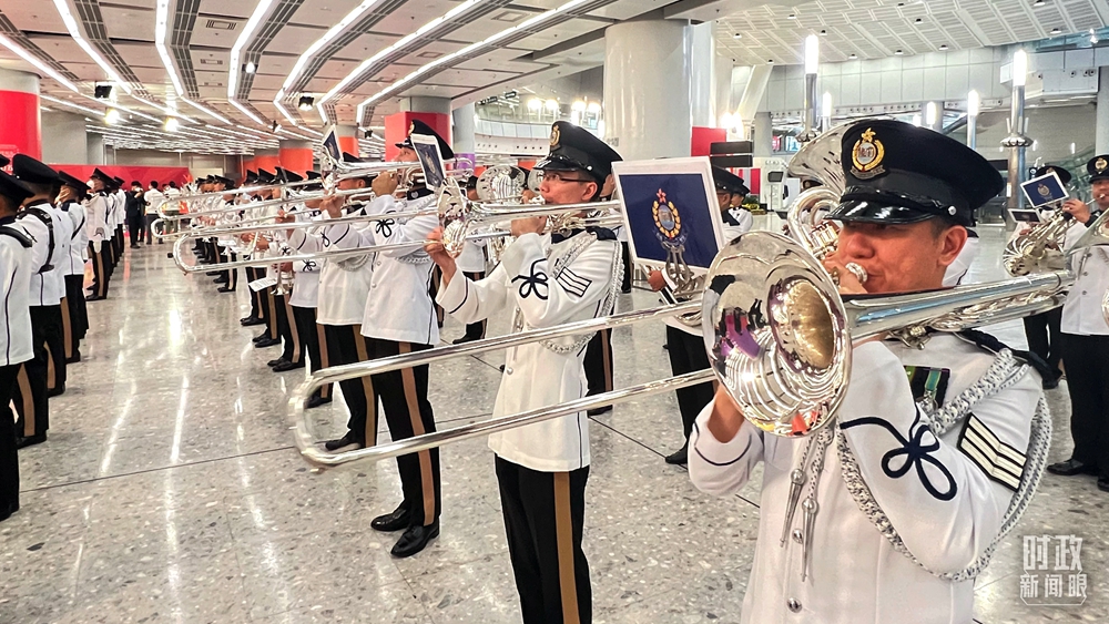 当天,香港西九龙站内,红色的地毯、鲜艳的旗帜、涌动的花束,表达着香港市民的热忱。欢迎仪式上,由80人组成的香港警察乐队奏响欢迎曲。这是一支有着70多年历史的“元老”乐队。因为他们使用的乐器都是银色,所以又被称为“银乐队”。