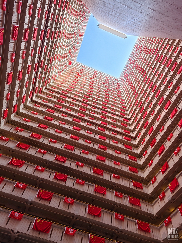 香港坪石邨金石楼,每层栏杆都挂上了国旗和区旗。(总台央视记者杨光拍摄)