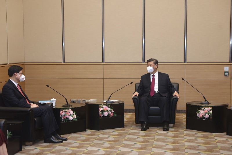 7月1日上午,国家主席习近平在香港会见刚刚就职的香港特别行政区行政长官李家超。新华社记者 鞠鹏 摄