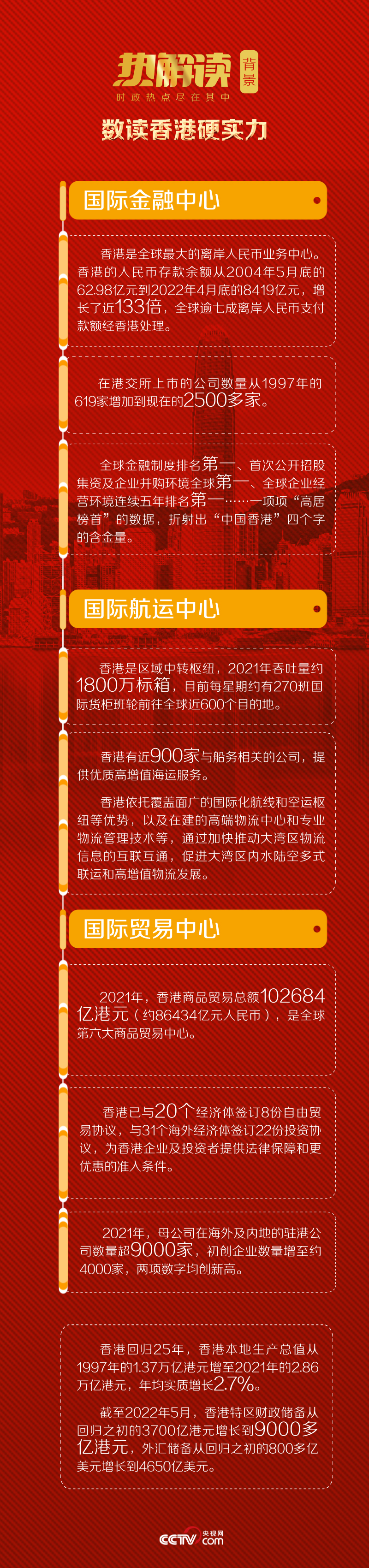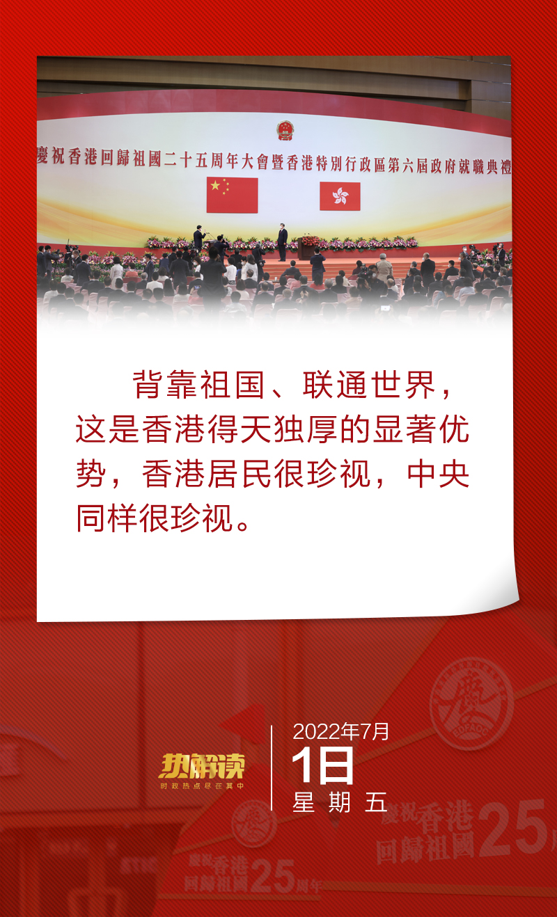 在庆祝香港回归祖国25周年大会暨香港特别行政区第六届政府就职典礼上,习主席明确表示:“中央政府完全支持香港长期保持独特地位和优势,巩固国际金融、航运、贸易中心地位。”