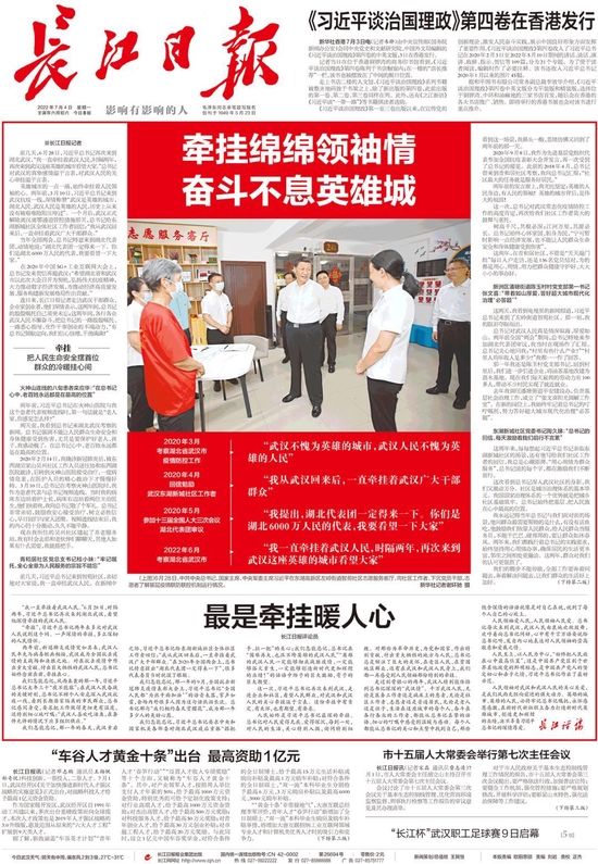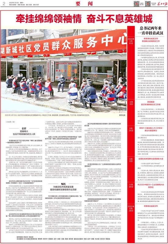 英雄城市的一点一滴,始终牵挂着人民领袖的心。两年前,3月10日,习近平总书记来到武汉抗疫一线,深情称赞“武汉是英雄的城市,湖北人民、武汉人民是英雄的人民,历史上从来没有被艰难险阻压垮过”。一个月后,武汉正式解除离汉离鄂通道管控措施那天,总书记给东湖新城社区全体社区工作者回信:“我从武汉回来后,一直牵挂着武汉广大干部群众。”