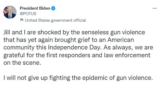 据美国哥伦比亚广播公司(CBS News)报道,当地时间7月4日,美国伊利诺伊州海兰帕克市的“独立日”游行中发生枪击事件,已至少6人死亡、超过20人受伤。拜登当天在推文中写道:“‘独立日’发生的毫无意义的枪击暴力事件再次给美国社区带来悲痛,吉尔(拜登夫人)和我对此感到震惊。”