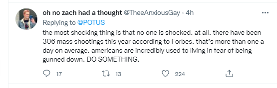 伊利诺伊州州长普利兹克(Pritzker)就此事发表讲话称“没有言语”可以形容那些遇难者和受伤者的亲属在这一天所遭遇的损失和悲伤。普利兹克表示:“在公开庆祝‘独立日’时,(枪手)藏在屋顶上,用突击步枪射杀无辜的人,这种邪恶没有言语可以形容。我也无法说出任何言语来减轻那些家庭的痛苦,他们的 7月4日不是‘庆祝’,而是‘悲伤’。”根据非营利组织的数据,此次枪击已是美国今年发生的第308起大规模枪击事件。美媒称,“独立日”的这起大规模枪击事件让美国本已血腥的春季和夏季“更加血腥”。