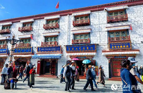 环绕拉萨八廓古城,开满了藏装店。人民网 李海霞摄