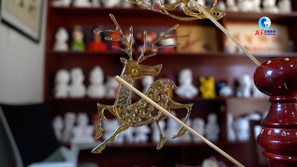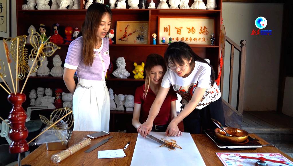 在店里,新华社记者与安吉丽娜现场学习糖画制作,绘制十二生肖等各种图案,感受中国民间非遗的魅力。