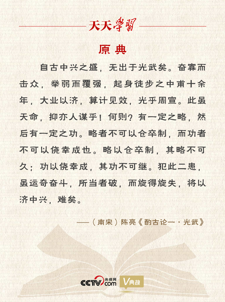 《酌古论》评价了刘秀、刘备、曹操、孙权、苻坚、韩信、诸葛亮等十九位历史人物的军事活动。首篇为光武帝刘秀,陈亮认为,自古中兴之盛,没有超过光武帝的,他成就掀天揭地的功业,不光是靠天命,更是靠人的谋略。由此提出:“有一定之略,然后有一定之功。略者不可以仓卒制,而功者不可以侥幸成也。”“仓卒”,同“仓猝”。意思是说,有一定的谋略,然后才能建立相当的功业。谋略不可以仓猝制定,而且功业不可能侥幸取得成功。并指出:“略以仓卒制,其略不可久;功以侥幸成,其功不可继。”谋略如果仓猝制定,也不可能长久实施;功业即使侥幸取得成功,也不可能持续发展。