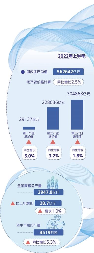 今年上半年,国际环境更趋复杂严峻,国内疫情多发散发,超预期突发因素给经济运行带来严重冲击。各地区各部门加大宏观政策调节力度,有效实施稳经济一揽子政策措施,二季度经济顶住压力实现正增长,夏粮再获丰收,工业生产企稳回升,能源生产稳定增长,服务业逐步恢复,高质量发展态势持续。
