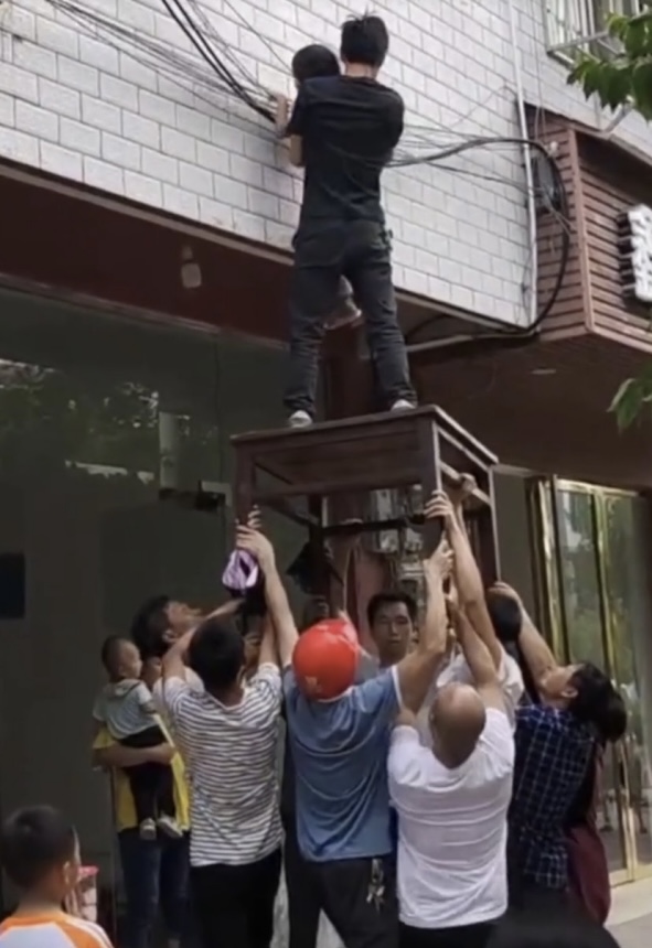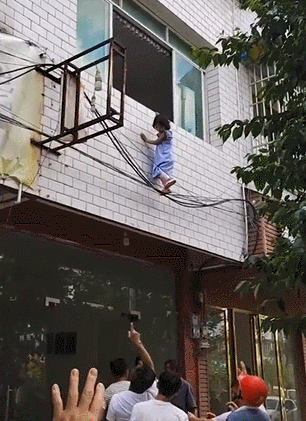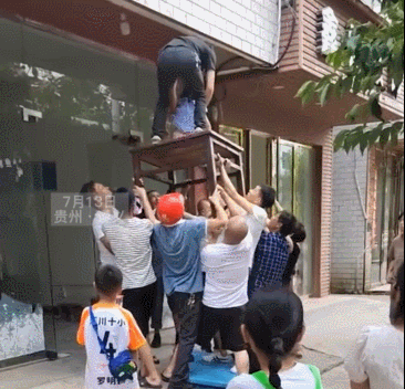 7月13日,贵州遵义一名小女孩被发现独自挂在房屋外墙上,一只脚仅凭几根电线悬吊着,而另一只脚已经踩空,身子在半空中晃晃荡荡,小小的手掌眼看已经快要抓不住窗沿,实在让人捏一把冷汗。就在这时,周围的路人赶紧冲上前来,一边高声提醒女孩千万不要动,稳定她的情绪,一边抬桌子的抬桌子,救人的救人,短短十几秒就搭起了一道"人梯",成功将小女孩安全救了下来。