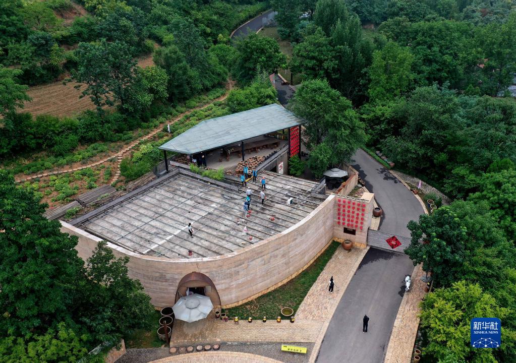 游客在“洛阳三彩陶艺村”游览拍照(7月12日摄,无人机照片)。新华社记者 李安 摄