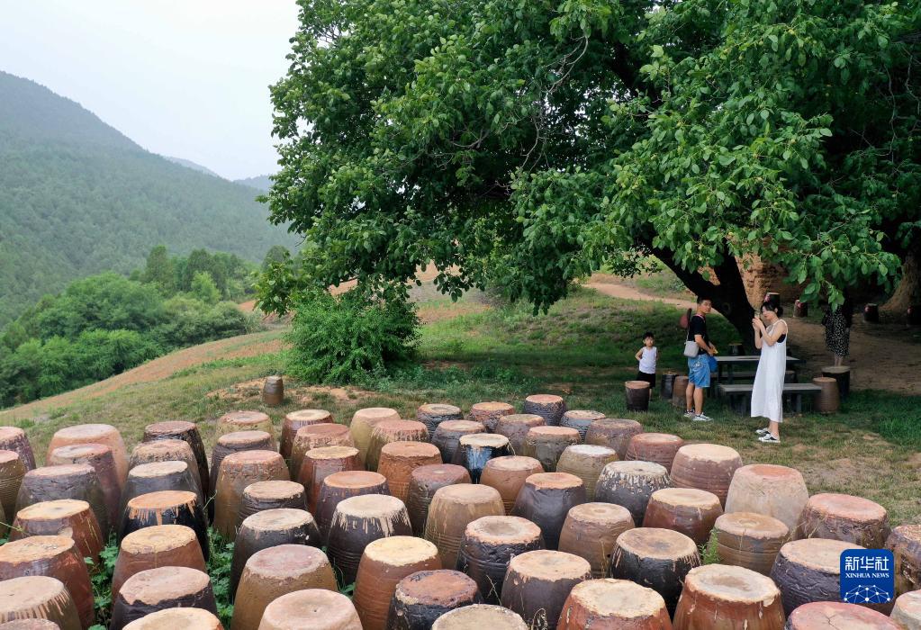 游客在“洛阳三彩陶艺村”游览(7月12日摄,无人机照片)。新华社记者 李安 摄