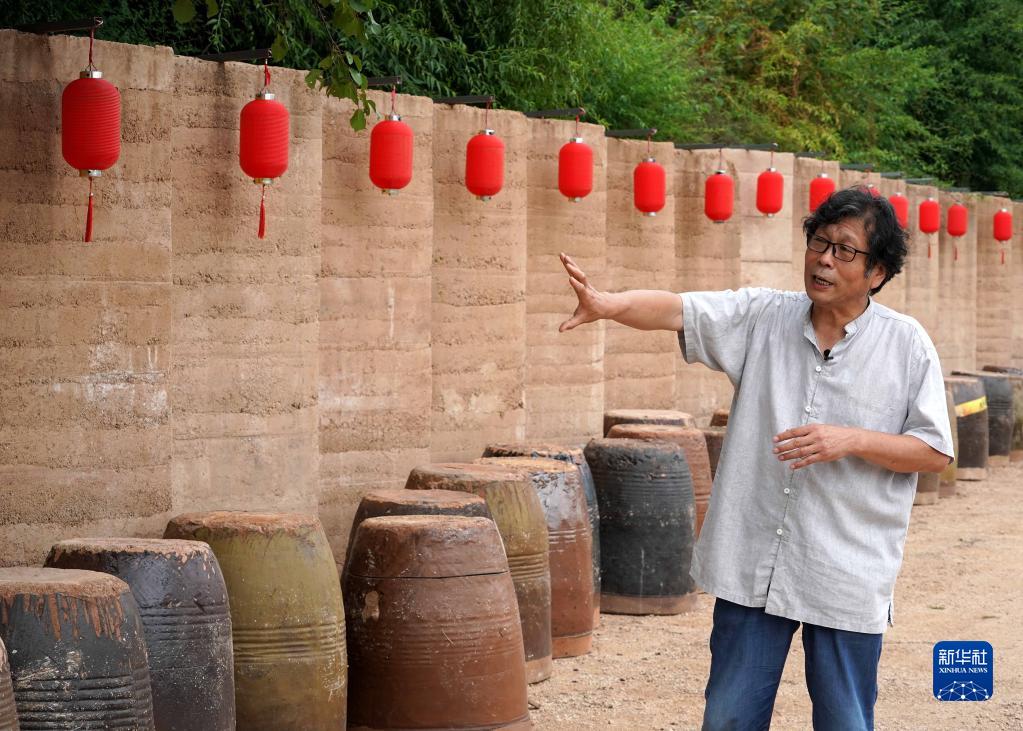 郭爱和在“洛阳三彩陶艺村”向参观者介绍一处景观(7月12日摄)。新华社记者 李安 摄