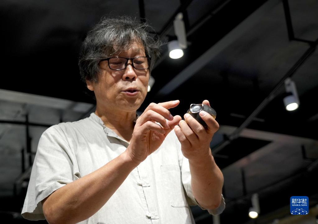 郭爱和在“洛阳三彩陶艺村”向参观者介绍陶瓷作品(7月13日摄)。新华社记者 李安 摄