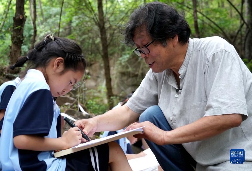 在“洛阳三彩陶艺村”,郭爱和指导罗岭乡中心小学学生写生(7月12日摄)。新华社记者 李安 摄