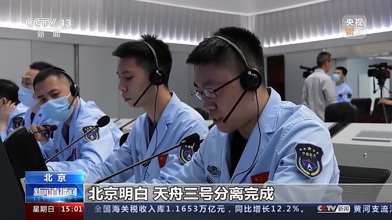 总台央视记者 刘冠青:这里是北京航天飞行控制中心,我们可以从我身后的大屏幕看到,现在天舟三号已经完成了中国空间站天和核心舱前向对接口的分离,现在正在转19米的保持。
