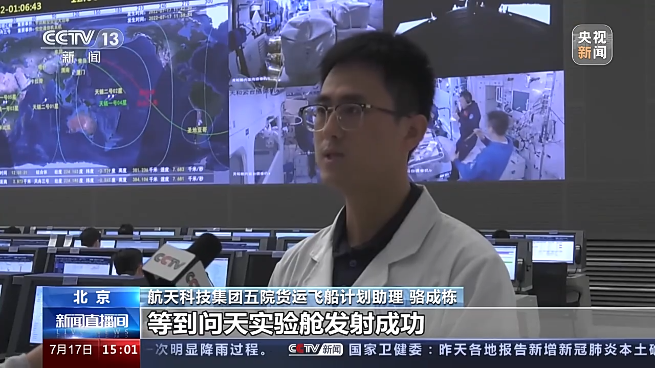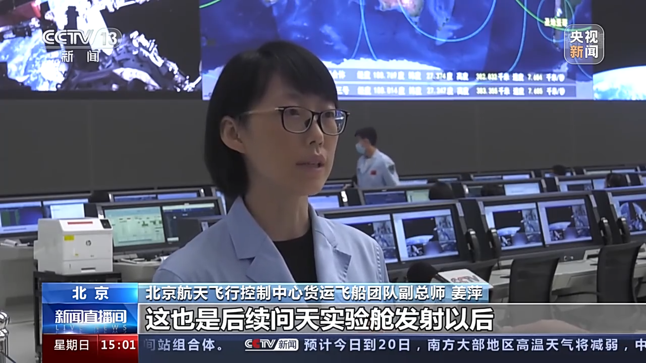 航天科技集团五院货运飞船计划助理 骆成栋:天舟三号目前已经进入一个独立飞行的状态,然后等到问天实验舱发射成功与这个空间站组合体完成对接之后,我们的天舟三号将会触控离轨,届时我们将会通过两次轨道的控制,然后将天舟三号飞船的轨道降低。