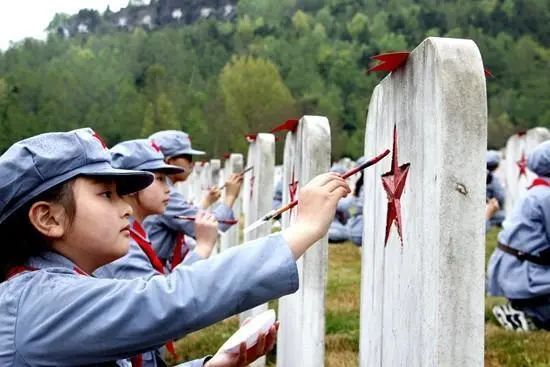 少先队员们用毛笔蘸上油漆,一点一点地把褪色的五角星重新描红。白色的墓碑在山坡上整齐排列,五角星重现了红色的光泽。队员们通过这种方式缅怀先烈、致敬英雄。