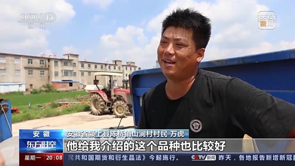 安徽颍上县陈桥镇山涧村村民 万虎:今年赶个丰收年,我的收成也比较满意,他给我介绍的这个品种也比较好。