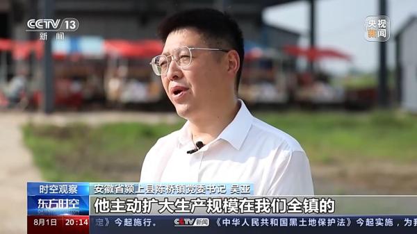 安徽颍上县陈桥镇党委书记 吴亚:他主动扩大生产规模在我们全镇的示范带动作用是非常明显的,如果我们镇有十个八个像老蔡这样的粮食经纪人,新型经营主体,那么全镇6.5万亩耕地都种上优质专用小麦也是指日可待了。