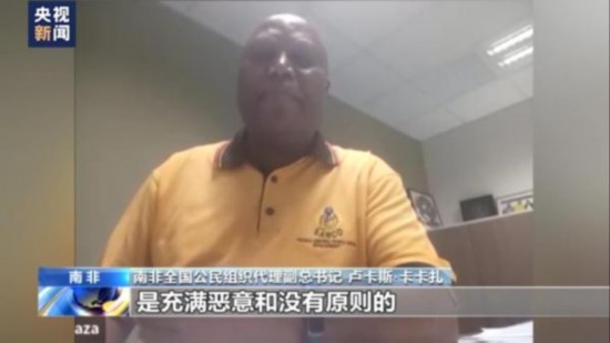 南非全国公民组织代理副总书记 卢卡斯·卡卡扎:我们认为美国在处理中美关系方面是充满恶意和没有原则的。我们希望全世界都应该警惕、谴责美国的行为。
