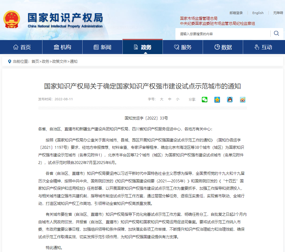 国家知识产权局关于确定国家知识产权强市建设试点示范城市的通知