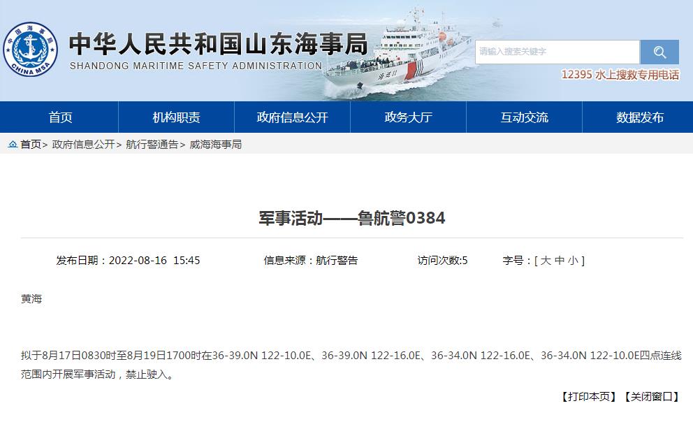 中新网8月17日电 据山东海事局网站16日消息,威海海事局发布航行警告,8月17日8时30分至8月19日17时,黄海部分海域将开展军事活动,禁止驶入。