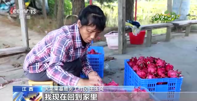 火龙果基地务工村民 王玉风:以前在外面打工,我现在回到家里,家里发展得很好。我现在在这里做事,3000多块一个月,照顾着小孩,照顾着老人。