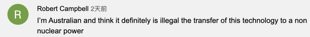 澳大利亚网友Robert Campbell表示:“我是澳大利亚人。我认为将这个技术转让给一个无核国家绝对是不合法的。”