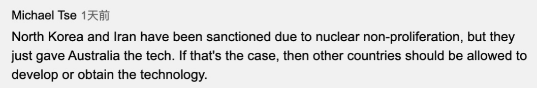 英语网友Michael Tse:“朝鲜和伊朗因不扩散核武器条约而受到制裁,但美国和英国把技术给了澳大利亚。如果可以这么做的话,那么其他国家应该被允许开发或获得核技术。”