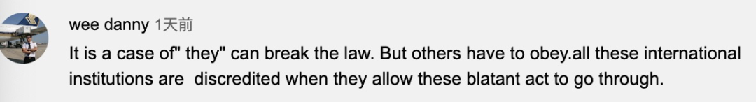 英语网友wee danny:“这又是一个双标案例。‘某些国家’可以违反,但其他人必须服从。所有允许这种明目张胆的双标行为的国际机构,都将名誉扫地。”