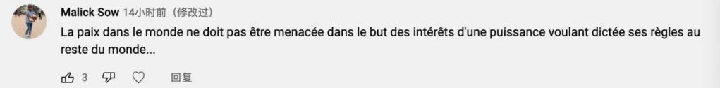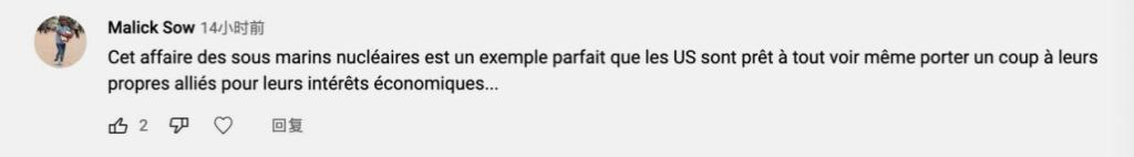 法语网友Malick Sow:“不能为了一个想要将其规则强加给世界其他地区的大国的利益而威胁到整个世界的和平。”“这起核转让事件就是一个完美的例子,美国随时准备一切行动,甚至能为了经济利益打击自己的盟友。”