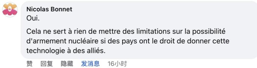 法语网友Nicolas Bonnet:“是的。如果各国有权将这种技术提供给盟友,那么限制核武器是没有意义的。”