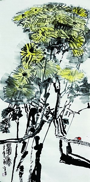 正因为在中国文化中菊花很早就被赋予了浓浓的文化之气,画菊也成为一种传统,延续了千年以上。唐宋时期,黄荃、赵昌、徐熙、滕昌佑、朱绍宗等名家也都是画菊高手,但都以工笔见胜,《宣和画谱》记载,黄筌《寒菊蜀禽图》,画得十分精美。宋末元初的郑思肖,以善画兰花著称,其父号“菊山”,郑思肖自号“菊山后人”,承其父志。他画兰亦画菊,曾有诗:“花开不并百花丛,独立疏篱趣无穷。宁可枝头抱香死,何曾吹落北风中。”成为古代咏菊中的名篇。元代赵彝斋、李昭、柯九思、王若木、苏明远、盛雪蓬、朱樗仙诸逸士也是画菊高手。元代之后,文人画家多以写意取代唐宋所沿袭的工笔,另开新局,明代画菊是以吴门画派的陈淳和王榖祥为代表,陈淳《菊石图》和王榖祥《翠竹黄花图》都以菊为题材。徐渭,以大写意画菊擅长,干湿浓淡,出神入化,既把菊花的冷峻突傲,独立自善的情态表现生动,又把菊花自身的和野逸之气表现得透彻淋漓。清初恽寿平以“色晕水染”之法画菊花,兼工带写,打破多年传统,自然而神态微妙。清季以来石涛、朱耷、任伯年、奚冈、恽寿平、郑板桥、赵之谦、蒲华、虚谷、高凤翰、徐玟、邹一桂,以及“扬州八怪”的罗聘、李方膺、李鱓、边寿民、金农等在画菊的一项上都各擅胜场,皆占一格,其后,吴昌硕金石笔法,齐白石温润蕴藉,潘天寿空间构图,李苦禅浓笔带染,林风眠中西融合,娄师白恬淡雅致。此外,还有陈师曾、张大千、王一亭、诸乐三、吴茀之、冯超然、符铁年、汪慎生、陈之佛等近代名家,都各得其法。当代花鸟画创作也是突飞猛进,沉浸传统而出新意,新气象新意象迭出,如吴悦石、张立辰、郭石夫、乔宜男等。