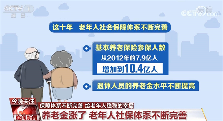 这十年,老年人社会保障体系不断完善,基本养老保险参保人数从2012年的7.9亿人增加到10.4亿人,退休人员的养老金水平不断提高;老年健康与医养结合服务纳入基本公共卫生服务项目,全民医保基本实现,基本医疗保险覆盖13.6亿人。