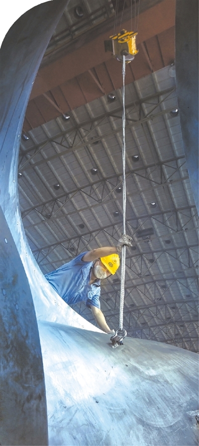 工人正在对白鹤滩水电站百万千瓦水电机组转轮叶片进行装配作业。白鹤滩机组精品标准要求的磁轭中心偏差为0.15毫米,叠装形成的磁轭中心相对理论中心偏差不超过0.02毫米,远优于精品标准要求。