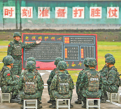 贯彻军委主席负责制,必须坚持中央军委集中统一领导,落实请示报告、督促检查、信息服务工作机制,完善监督问责工作机制。全军深刻领悟“两个确立”的决定性意义,全面深入贯彻军委主席负责制,做到绝对忠诚、绝对纯洁、绝对可靠。图为武警某部聚焦“忠诚维护核心、矢志奋斗强军”深化主题教育中开展宣讲活动。