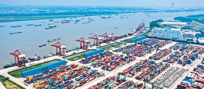 全力确保产业链、供应链安全稳定,是维护国家经济安全的重要举措。图为2022年5月6日拍摄的江苏省港口集团南京港龙潭集装箱有限公司港口。